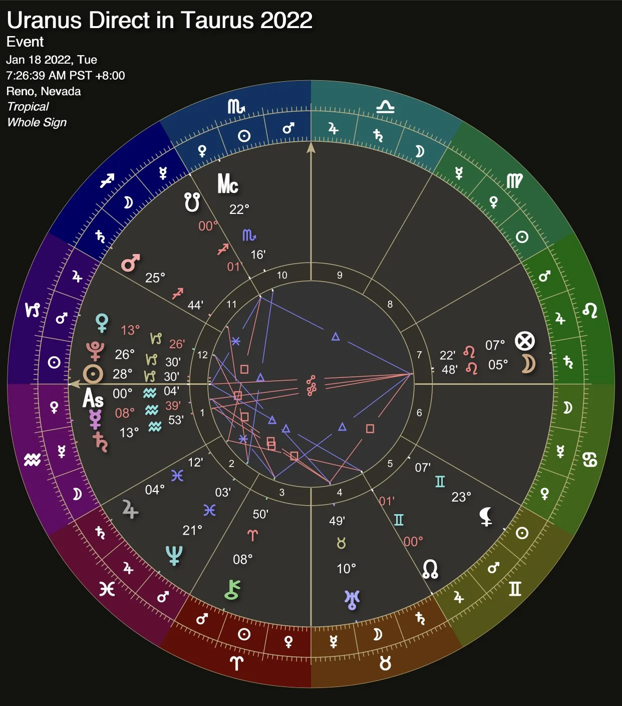 Uranus, the disruptor planet, stationed direct on January 18, 2022 at 10º Taurus. It retrograded at 14º Taurus on August 19, 2021. Uranus has been transiting Taurus since March 2019 and is nearly halfway done its seven year transit through this sign.